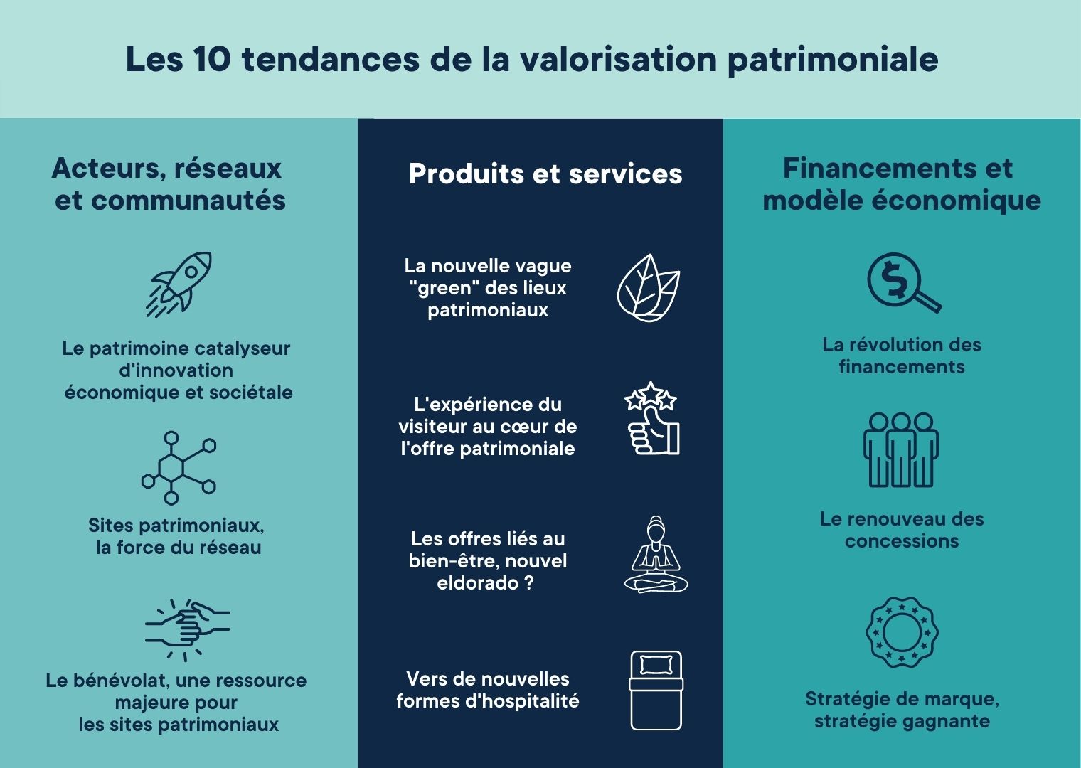 Atout France, la Banque des territoires et l’Agence nationale de la cohésion des territoires, dans le cadre du programme « Réinventer le Patrimoine » ) ont commandé une étude menée par Nova Consulting. Cette étude a notamment permis de déterminer les tendances de fond de la valorisation patrimoniale à partir de l’examen de nombreux exemples partout en France.