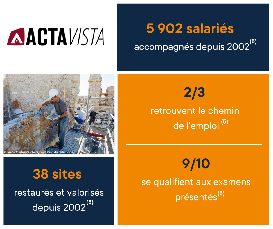 Depuis 2002, grâce à ACTA VISTA, le patrimoine historique en péril devient un levier pour aider des personnes en difficulté à se bâtir un avenir et permettre à tous de trouver une place au sein de la société. ACTA VISTA développe, sur les Monuments historiques qui lui sont confiés pour restauration, des chantiers d'insertion et de formation qualifiante aux métiers du patrimoine, dédiés aux personnes les plus éloignées de l'emploi.