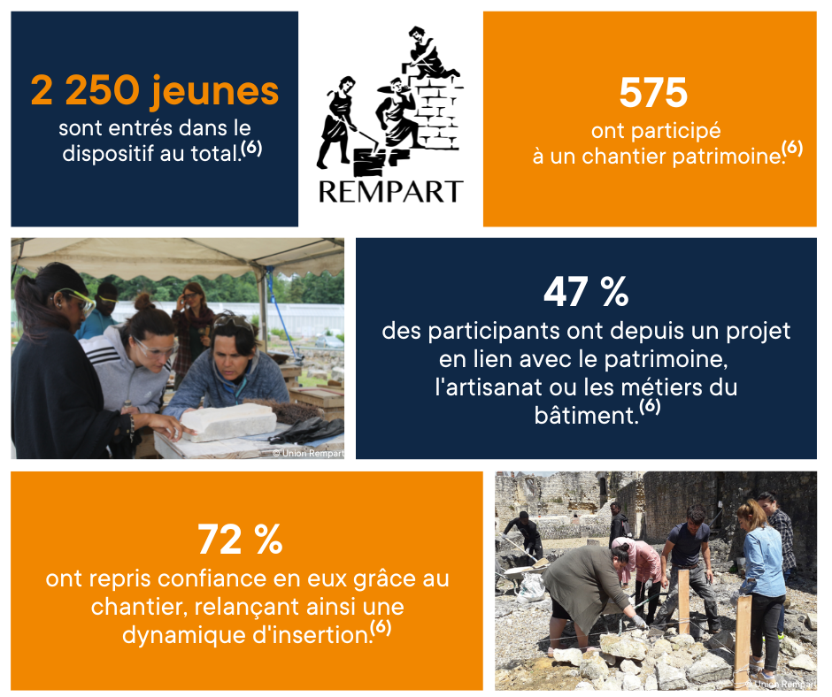 L’Union REMPART s’engage aussi pour la découverte du patrimoine et de ses métiers par l’organisation de chantiers de bénévoles (plus de 4000 participants chaque année), en menant en collaboration avec des structures d’insertion (Missions Locales, EPIDE, Ecoles de la 2ème chance...), l’action “Patrimoine & Lien Social”.