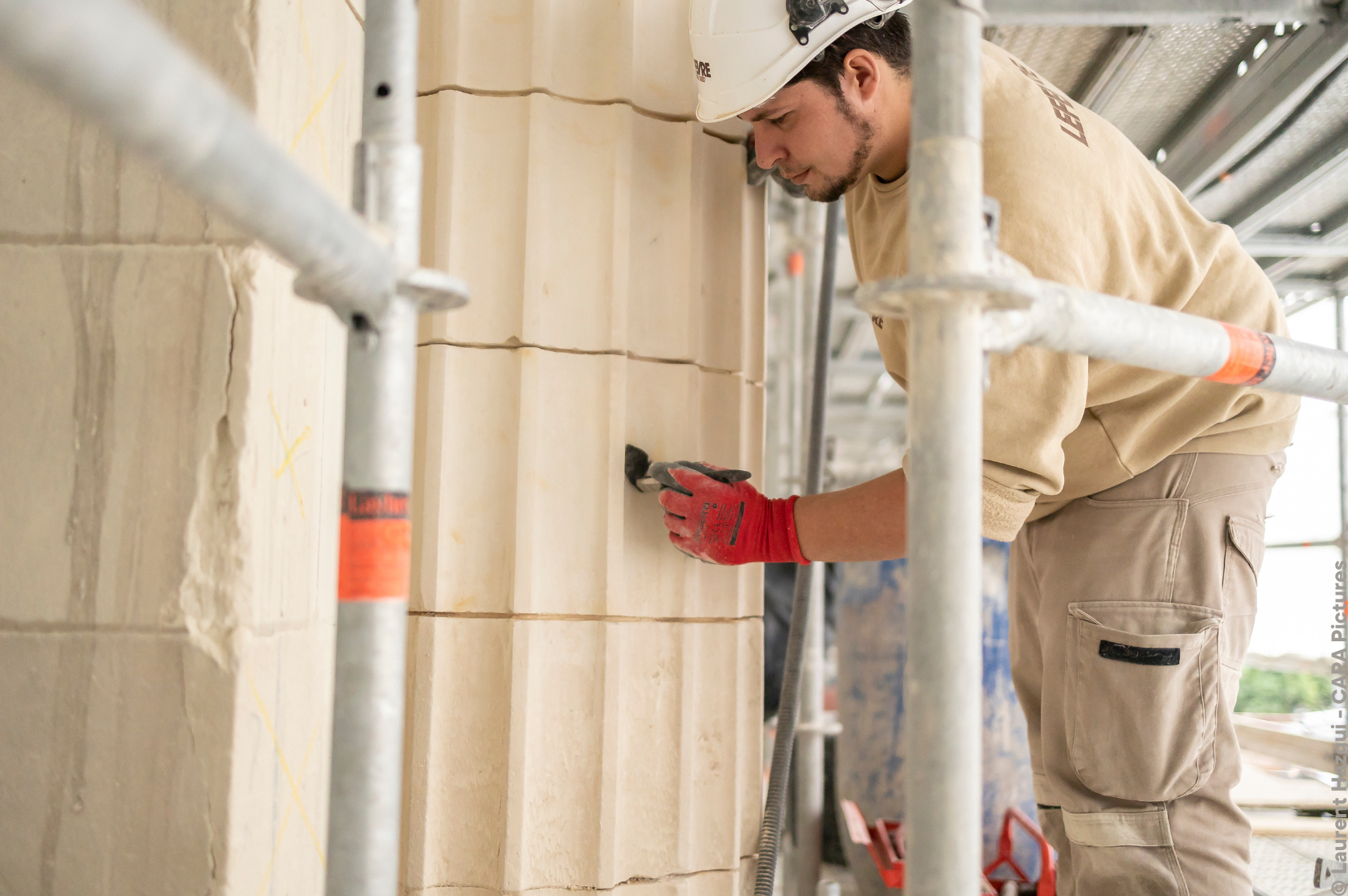 Il est employé par le GEIQ 49 - Groupement d’Employeurs pour l’Insertion et la Qualification du Maine-et-Loire - qui le met à disposition de l’entreprise de taille de pierre Lefèvre Centre Ouest. Très motivé depuis la découverte de la restauration du bâti ancien, Alex bénéficiera, à l’issue du chantier, d’un contrat en alternance auprès des compagnons du devoir en vue d’obtenir un CAP tailleur de pierre.