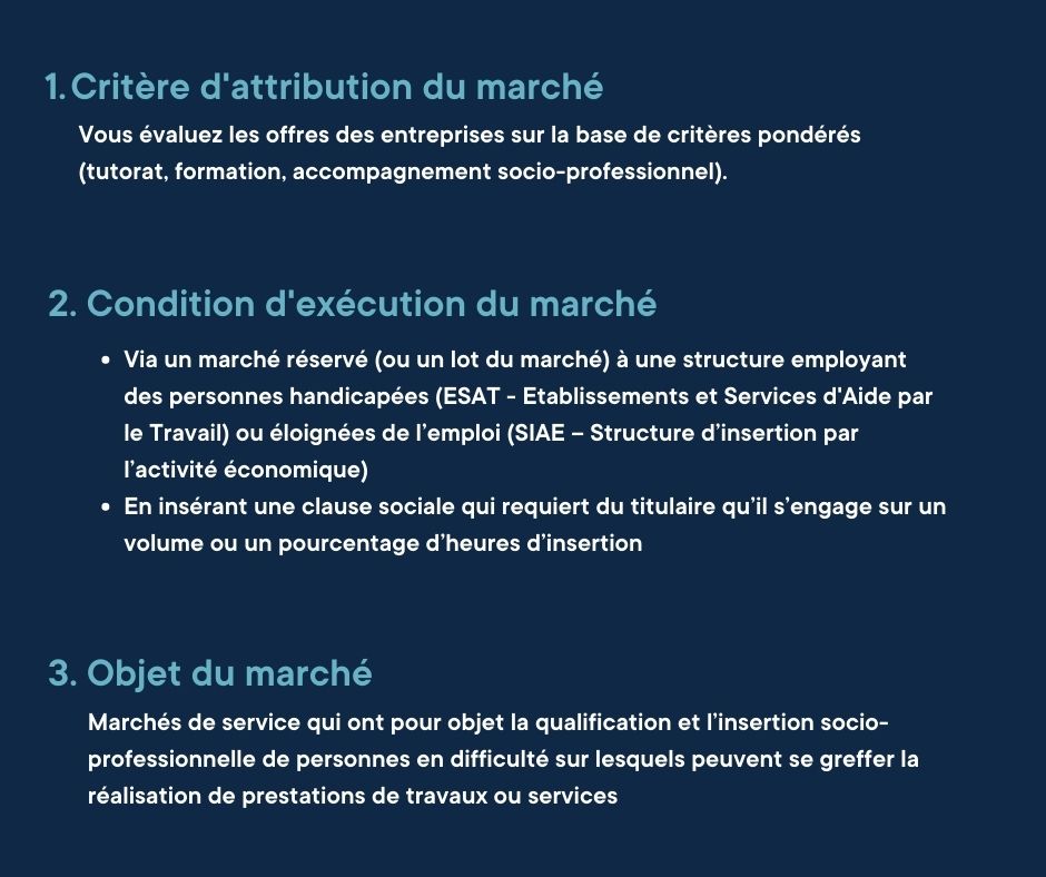 Vous pouvez prévoir dans vos appels d’offres des objectifs économiques et sociaux par le biais de clauses sociales conformes au Code des marchés publics. Ces clauses sont au cœur de la politique générale en matière d’achat public, parallèlement à la recherche d’une meilleure performance de la commande publique.