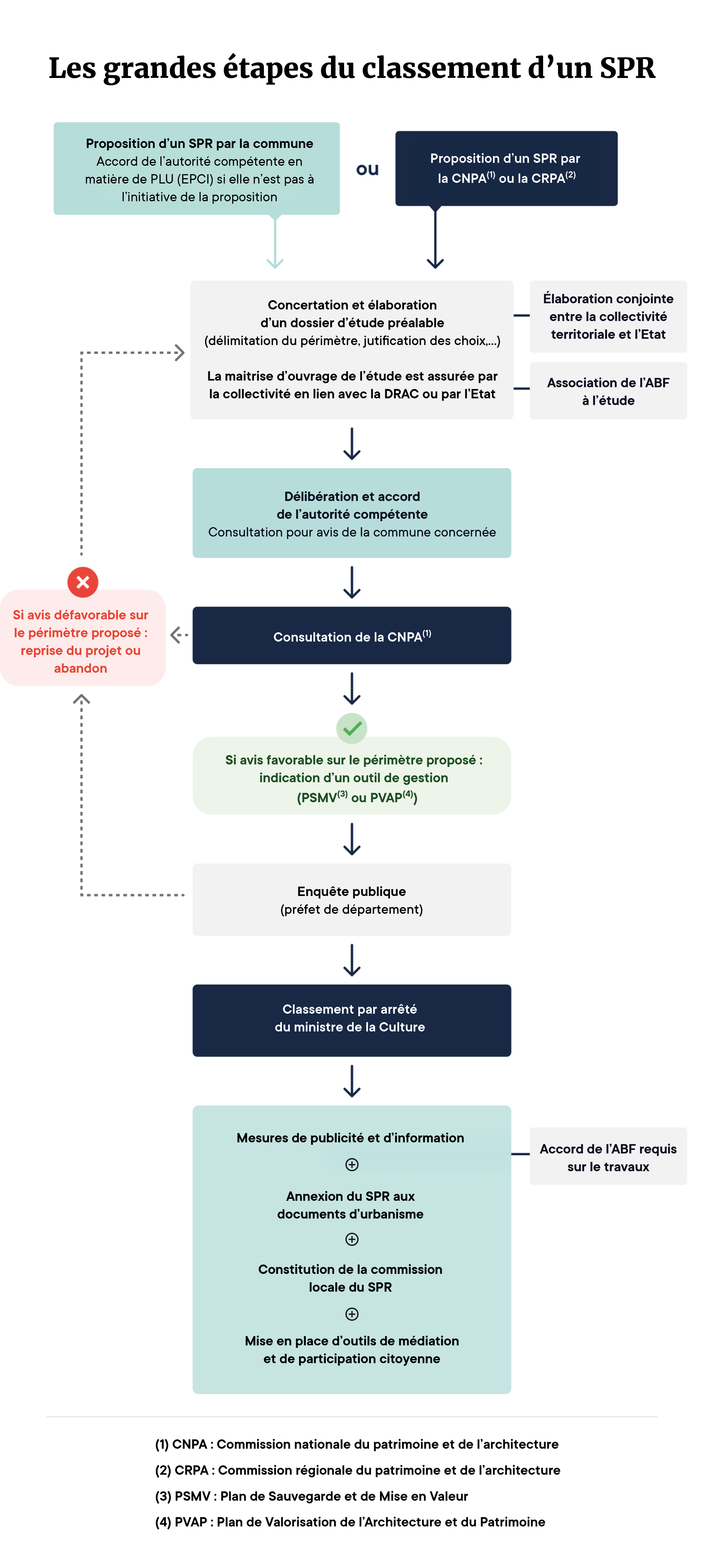 Les grandes étapes de la procédure de classement d’un territoire au titre des sites patrimoniaux remarquables (SPR).
