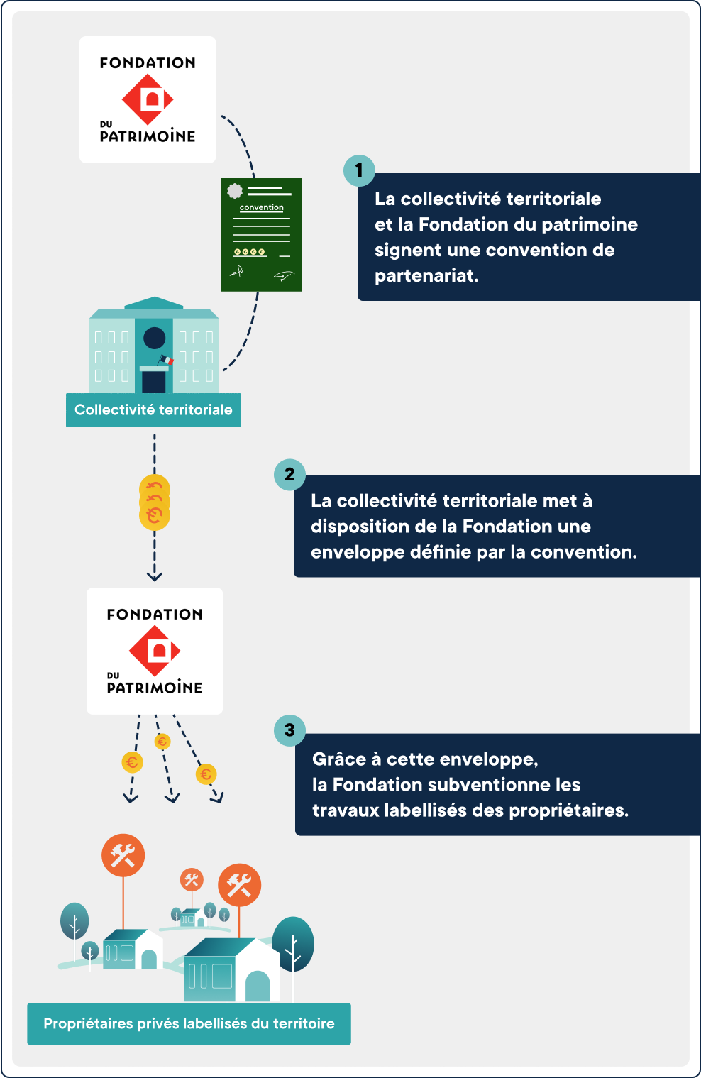 Dans le cadre d’une convention de partenariat avec la Fondation, un département, un EPCI ou une commune met à disposition de la Fondation une somme qui permettra de subventionner les travaux labellisés de leurs administrés. Les collectivités peuvent formaliser des critères de sélection pour identifier des priorités d'intervention géographiques, typologiques, etc. L’objectif est d’accorder une subvention de 20 % afin d’optimiser la déduction fiscale.