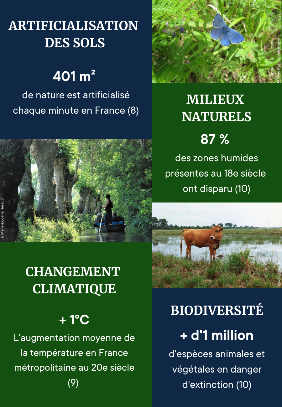 D’une extraordinaire richesse, il revêt une importance capitale puisqu’il abrite une partie essentielle de la biodiversité. Mais ce patrimoine est lui aussi soumis à de nombreux dangers puisqu’il est impacté directement ou indirectement par toutes les atteintes portées à l’environnement (artificialisation des sols, changement climatique, etc.). La biodiversité est d’ailleurs d’une richesse exceptionnelle en France : 10 % de la biodiversité de la planète s’y trouve, dont la majeure partie en Outre-mer (7). Il est ainsi essentiel de défendre et protéger ce patrimoine pour préserver l’environnement et sauvegarder nos espaces. Protéger le patrimoine, c’est contribuer à la préservation de l’environnement et de la biodiversité.